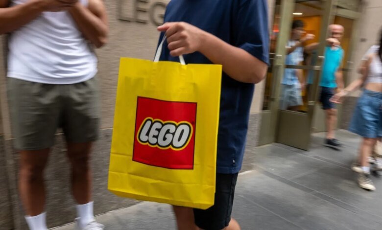 People depart a Lego store in Manhattan on August 29, 2024 in New York City.
