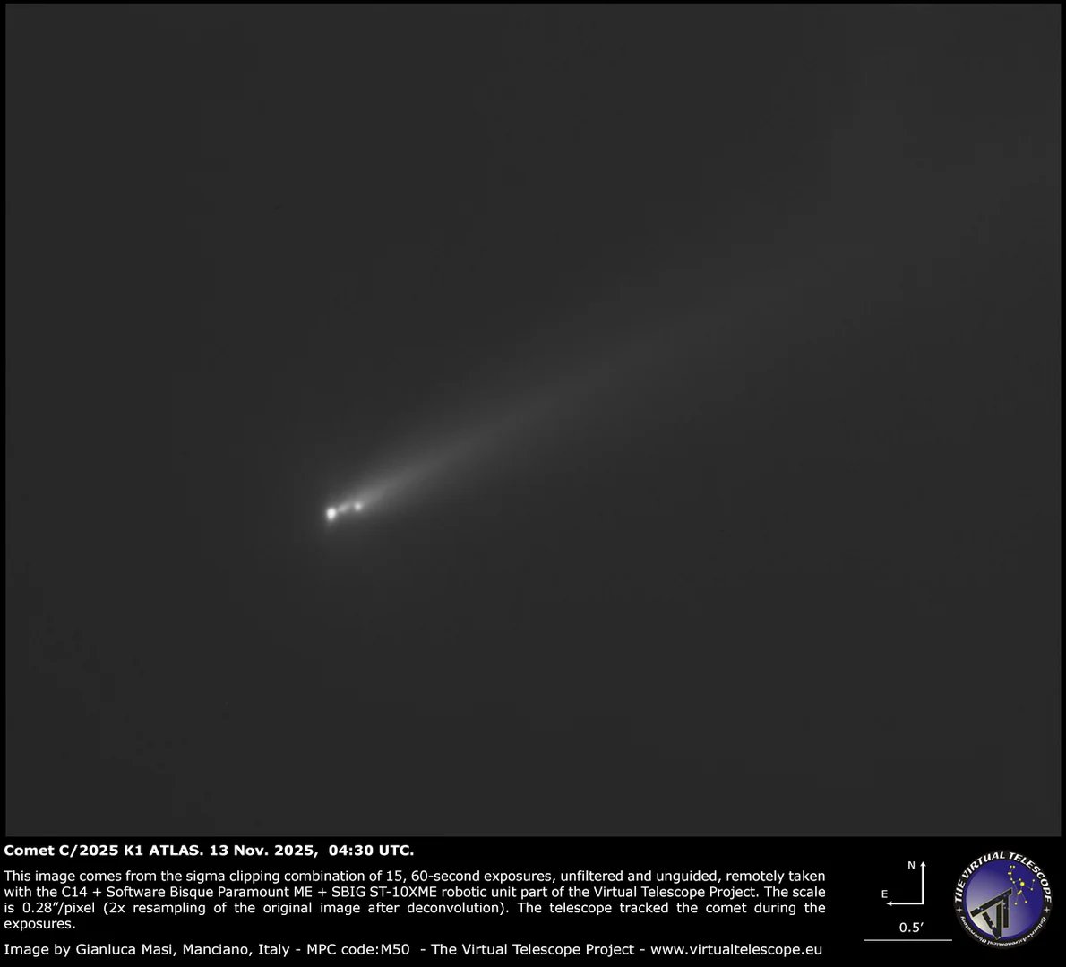 On 13 November 2025, astronomers captured something rare and amazing: Comet C/2025 K1 ATLAS has broken into pieces. At first, it looked like a huge cosmic explosion. But this is not the famous… pic.twitter.com/Q6ll8YTf2w