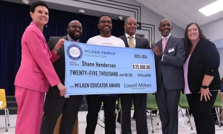 Shane Hendersona fourth grade teacher at Pittsboro Elementary Schoolreceived the Milken Educator Award, a national award known as the “Oscars of Teaching,” on Wednesday morning, according to a press release from the Milken Family Foundation.
