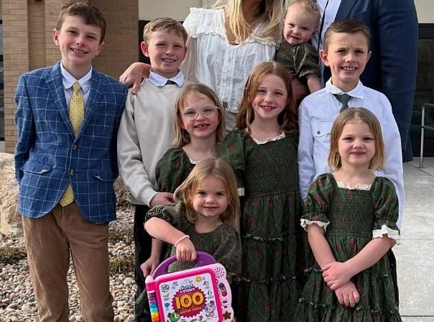 The controversial Ballerina Farm – run by social media star Hannah Neeleman and her husband, JetBlue heir Daniel Neelman – has angered citizens of Midway, where the couple’s first ever store opened last month. Pictured with their children