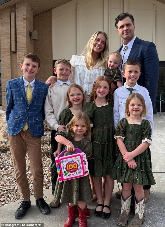 The controversial Ballerina Farm – run by social media star Hannah Neeleman and her husband, JetBlue heir Daniel Neelman – has angered citizens of Midway, where the couple’s first ever store opened last month. Pictured with their children