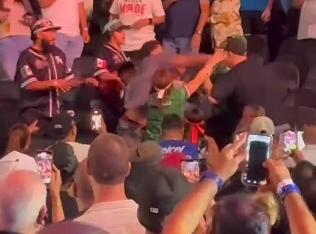 Some of those involved were wearing Canelo shirts and sombreros as the event briefly descended into chaos. They were eventually pulled apart, allowing the attention to return to the stage.