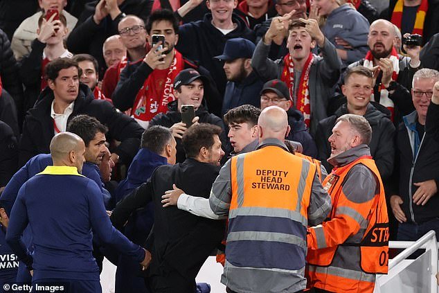 Diego Simeone tussled with jubilant Liverpool fans after the latest of winners from Virgil van Dijk in added time