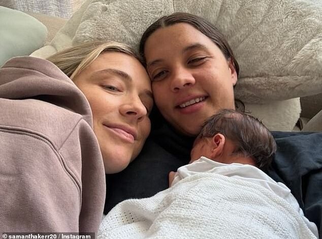 Sam Kerr (pictured with fiancée Kristie Mewis and their boy Jagger) says she’s still trying to wrap her head around being a mum