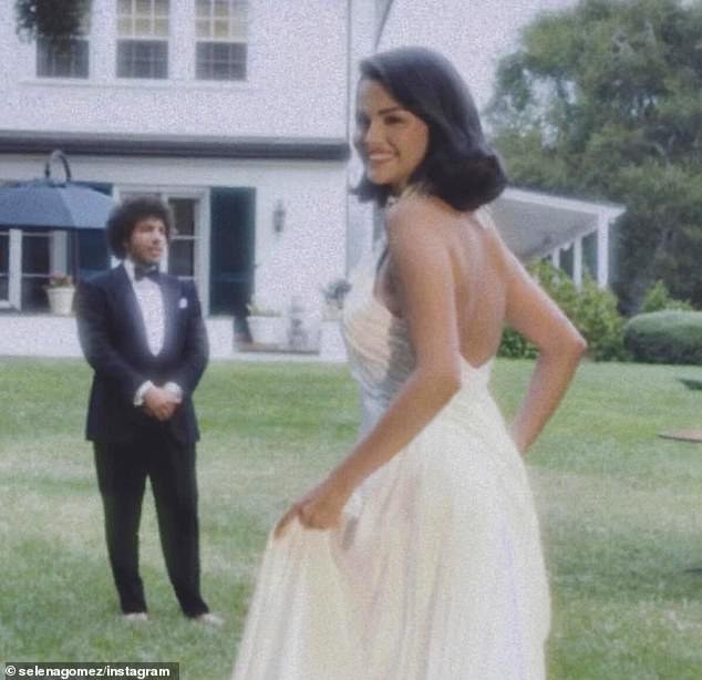 Another shot included the couple relaxing on a sofa together as the Bad Liar songstress showed off her lace wedding gown while Benny snapped the photo in a mirror.
