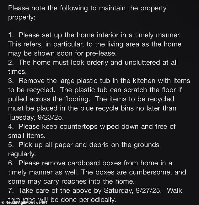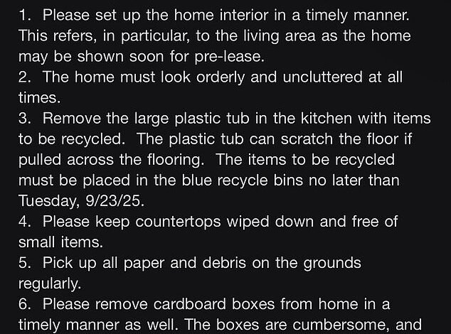 She told the tenants everything must be completed within days – threatening periodic walkthroughs to ensure the rules were being followed.