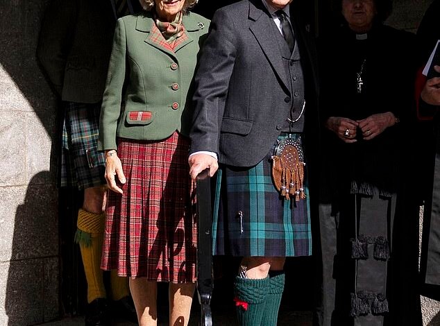 Queen Camilla meanwhile also opted for a red tartan skirt to match her husband – and was also seen with a black armband on her arm, as a sign of mourning for the late Duchess.