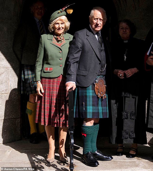 The monarch, 76, was seen wearing a traditional Scottish kilt as he stepped out for the service – which comes following a difficult week for the royal family after Buckingham Palace announced that the Duchess of Kent had passed away.