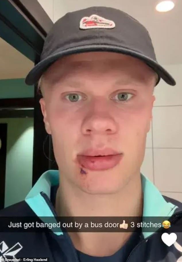 Haaland wrote: ‘Just got banged out by a bus door. 3 stitches.’