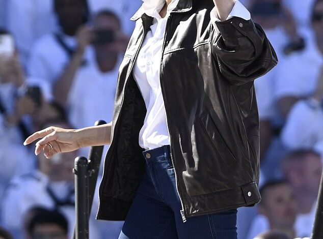 Melania, 55, took the stage this weekend to greet the Navy, as she yelled out, ‘Hooyah, Navy!’ three times to the crowd.