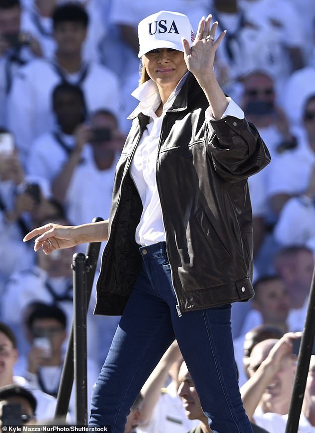 First Lady Melania Trump cut a casual-cool figure as she joined her husband in Virginia for the celebration of the U.S. Navy’s 250th birthday on Sunday – as she issued a rallying cry to the crowd.