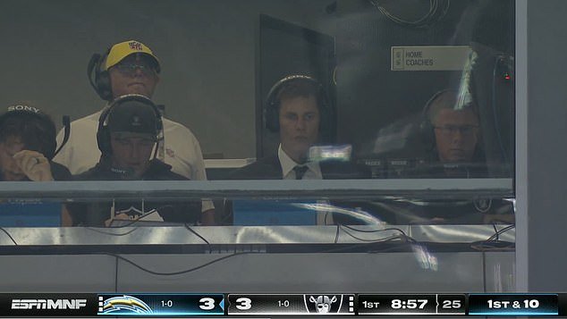 Fox Sports commentator and Las Vegas Raiders part-owner Tom Brady was spotted wearing a headset in the coach’s booth during a Monday Night Football game between the Raiders and the division-rival Los Angeles Chargers.