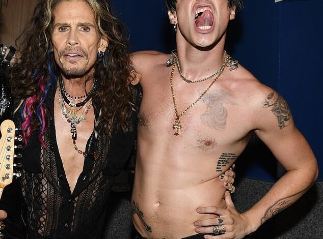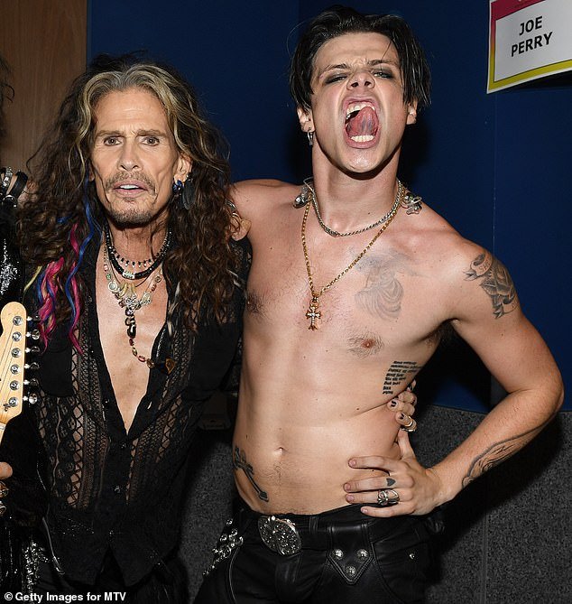 The shirtless, tattooed ex public schoolboy who’s broken into the mainstream this year after signing his first record deal at 21 stole the VMA show posing up a storm alongside Aerosmith’s Steven Tyler and Joe Perry.