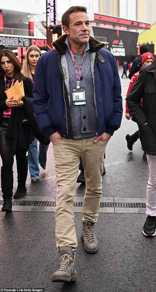 Ben Affleck appeared to have wrapped up warm in a disjointed ensemble of a $6,350 blue Brunello Cucinelli jacket with a brown shearling collar and gray sweater underneath along with beige pants and utility boots