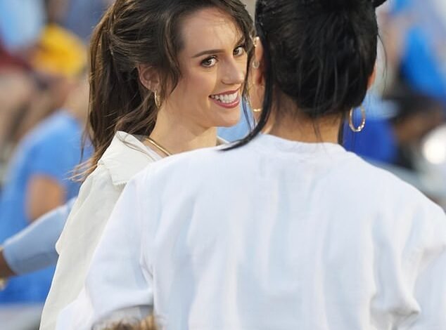 Hudson donned an all-white ensemble for the game – with a white tank top underneath an off-white jacket and paired with white sneakers and cargo pants.