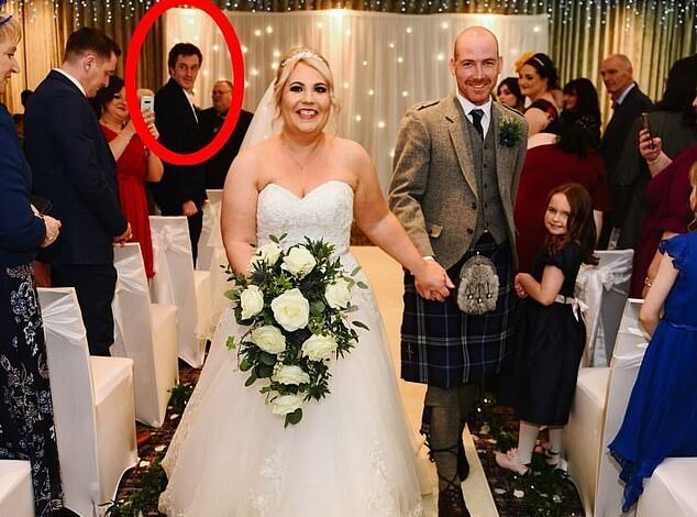 Michelle and John Wylie (pictured) had the picture-perfect wedding day at a boutique hotel in Ayrshire, but a tall dark-haired stranger in the back of their wedding photos has puzzled them for four years