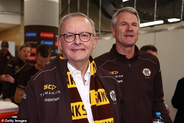 Hawthorn president Andrew Gowers surprised Anthony Albanese with a case of VB after the footy – but the PM preferred a beer that’s been named after him.