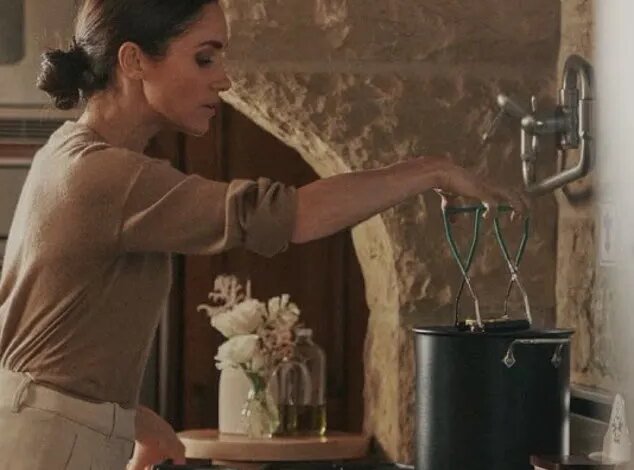 To accompany the new launch, Meghan shared new photographs of herself posing candidly in the kitchen of her Montecito mansion in Californiausing canning equipment to pull a jar of jam out of a large saucepan on the stove.