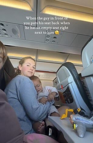 The mum said she was stunned when the unsuspecting passenger sitting in front decided to pull his seat back on the short-haul domestic flight.