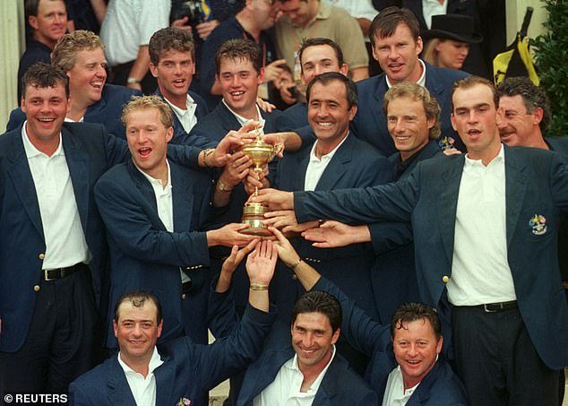 Captain Tony Jacklin, centre, lifts the 1989 Ryder Cup trophy. Faldo, top row second left, contributed 2.5 points in a drawn contest at the Belfry as Europe retained the Cup