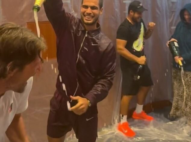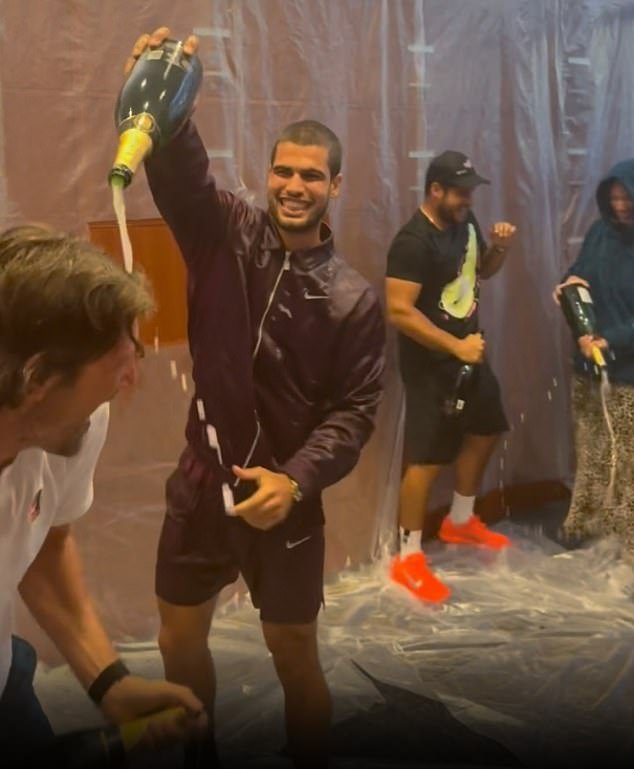 Alcaraz had sought to soak his team with champagne, but was instead covered in the changing room as they started the celebrations