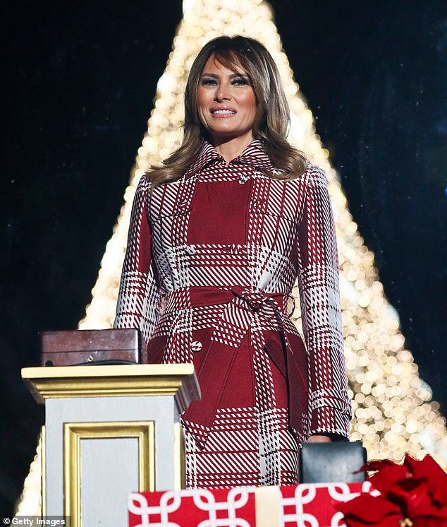 In 2018, she decorated the East Colonnade with 40 bold blood-red trees and draped 14,000 red ornaments throughout the White House (pictured)