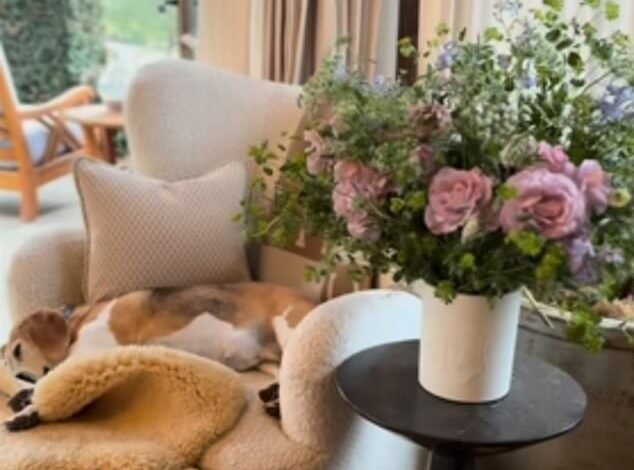 Sharing a clip on her Stories with her 4.2million followers, the mother-of-two showcased an elegant floral arrangement and her beagle, Mia, sleeping on a stunning cream armchair and matching cushioned footstool