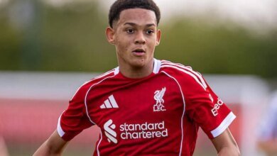 Palace sit in their 4-5-1 mid-block before Yeremy Pino, one of Palace’s two No 10s, races out to press Ibrahima Konate and wins the ball off the Liverpool defender to start a dangerous counter attack