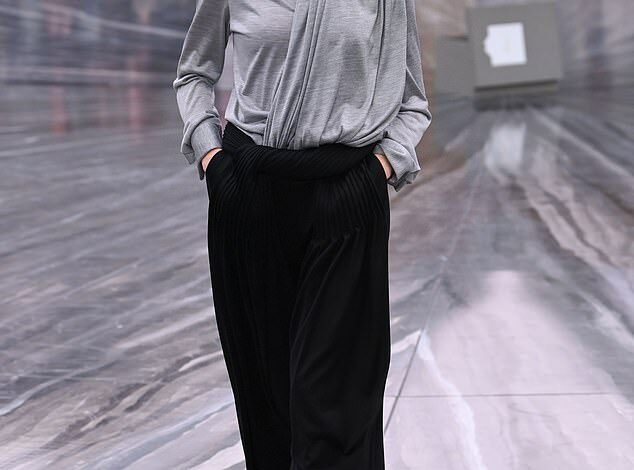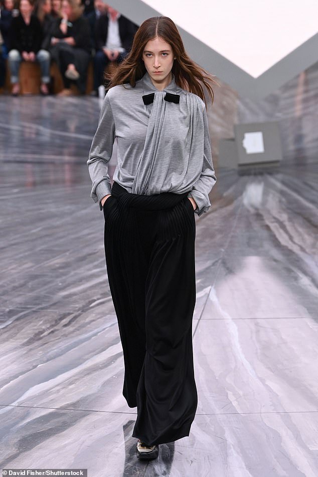 Sunday Rose Kidman-Urban, 17, in a grey blouse, black neck tie and black pleat-fronted trousers, appeared on the catwalk