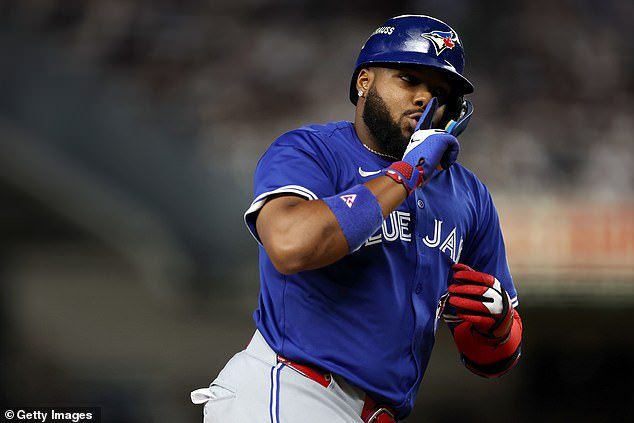 Vladimir Guerrero Jr. shushes the crowd after scoring a homer against the Yankees on Tuesday