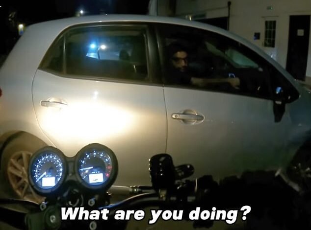 Visibly frustrated, the biker can be heard asking: ‘What are you doing?’