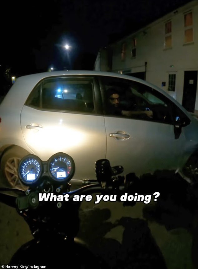 The footage shows Harvey riding his motorbike along a main road, when a car abruptly pulls out in front of him before cutting him off and forcing him to slow down.