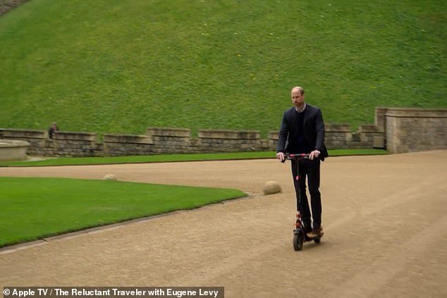 The Prince of Wheels! Moment William cruises through Windsor Castle grounds on an e-scooter during appearance on Eugene Levy’s travel show