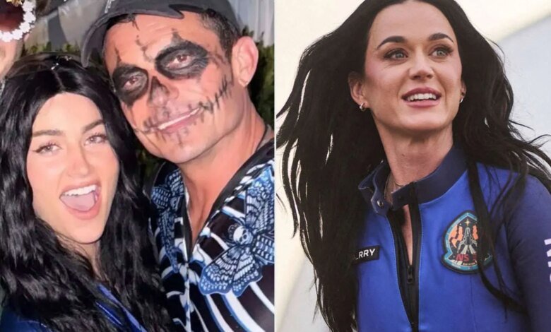 - Bloom, dressed as a skeleton, posed with the actress as she wore a blue bodysuit and black wig, reminiscent of Perry’s look worn during her Blue Origin flight