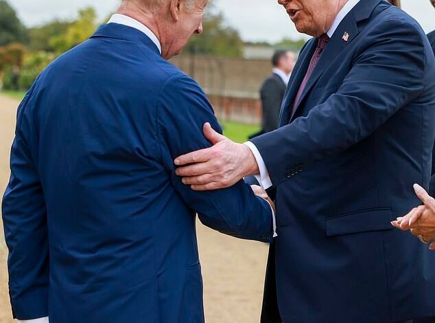 Trump shook hands with the King and the pair chatted enthusiastically together, with the President also placing his hand on Charles’s arm as they shook hands.